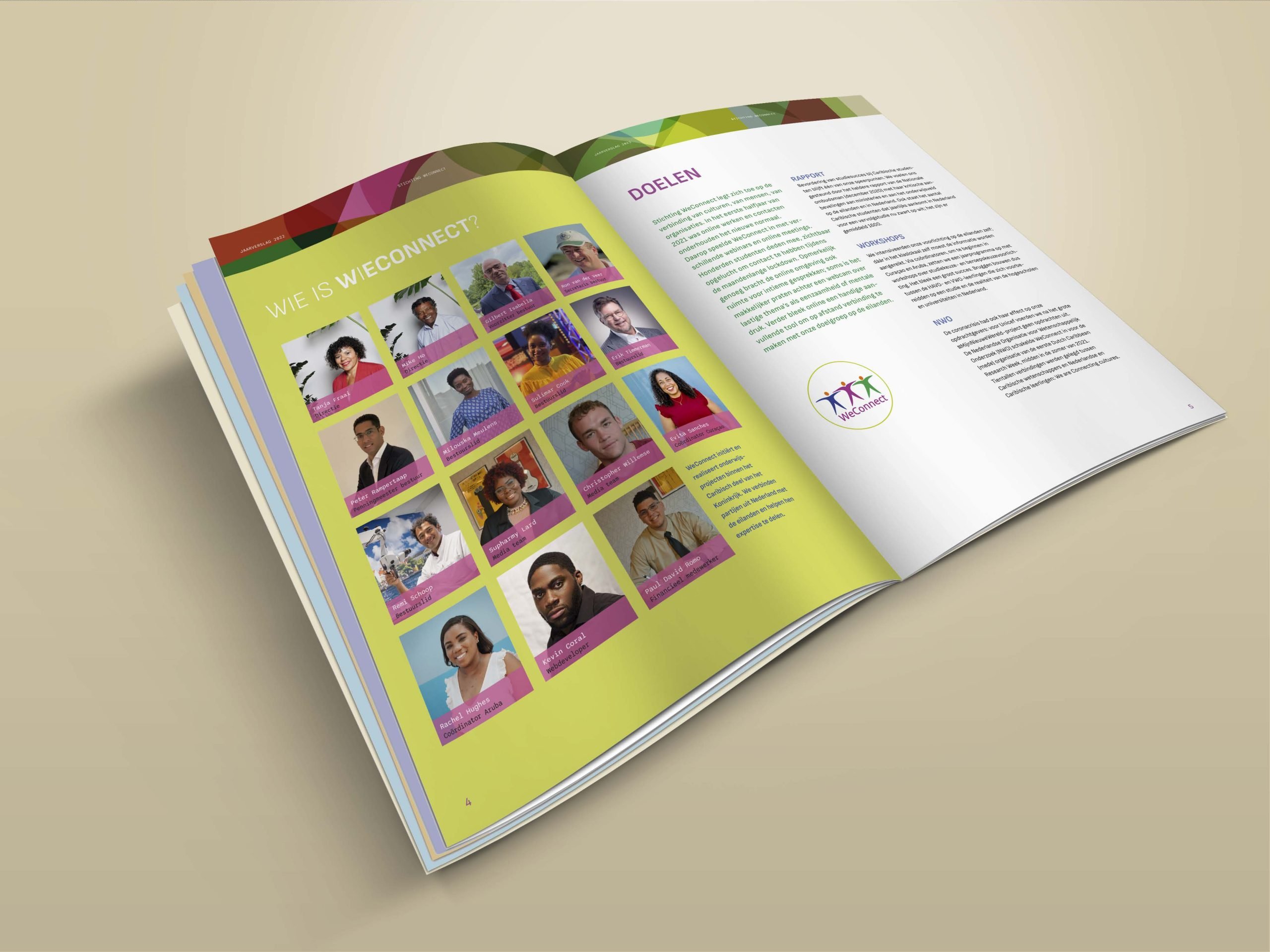 Stichting WeConnect is een educatieve stichting. WeConnect verbindt Nederland met Curaçao, Aruba, Sint Maarten, Bonaire, Saba en Sint Eustatius via educatieve (multimediale) projecten. Studenten en young professionals staan centraal bij onze projecten. Studio Dutches maakt de jaarverslagen.